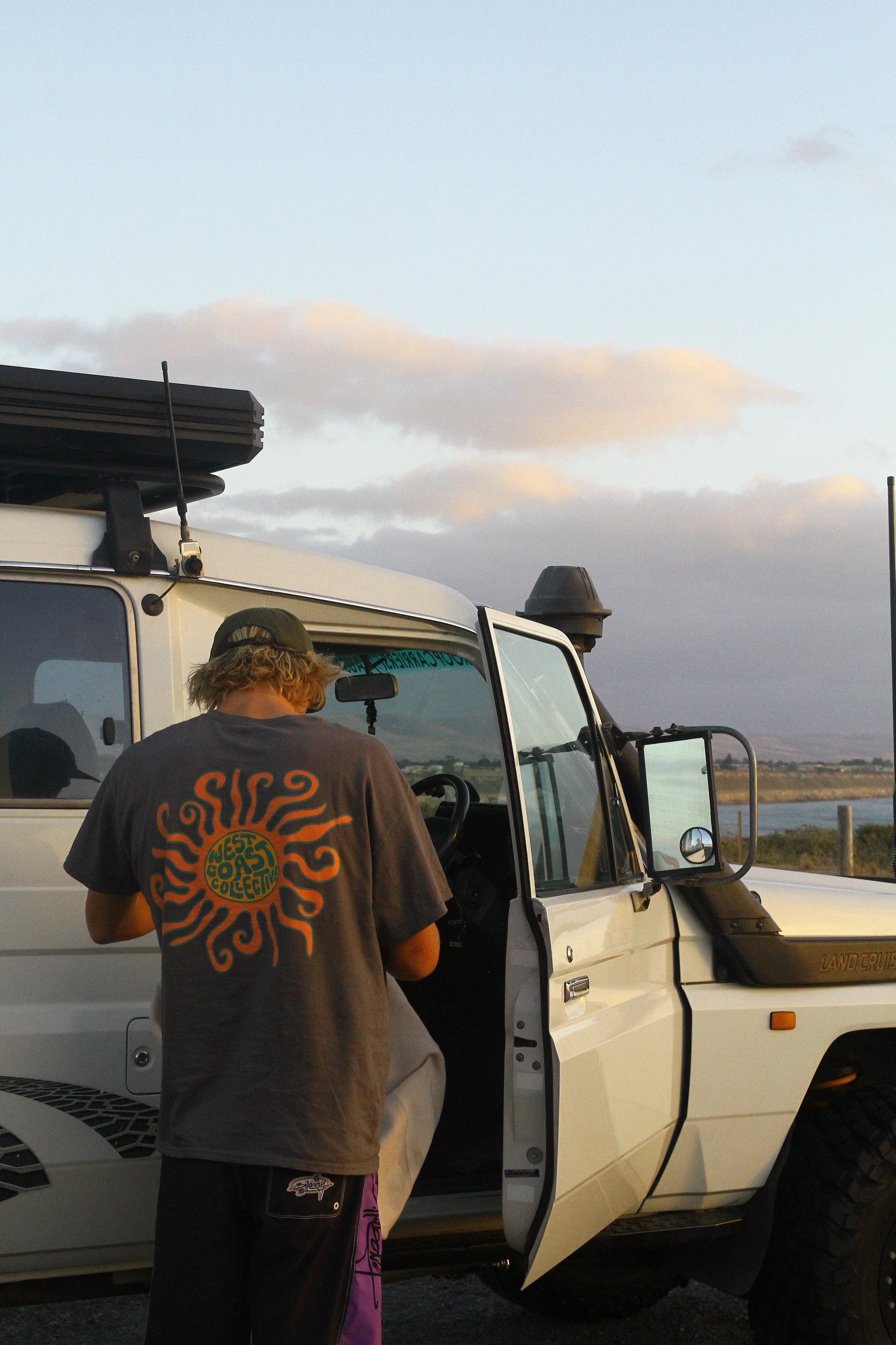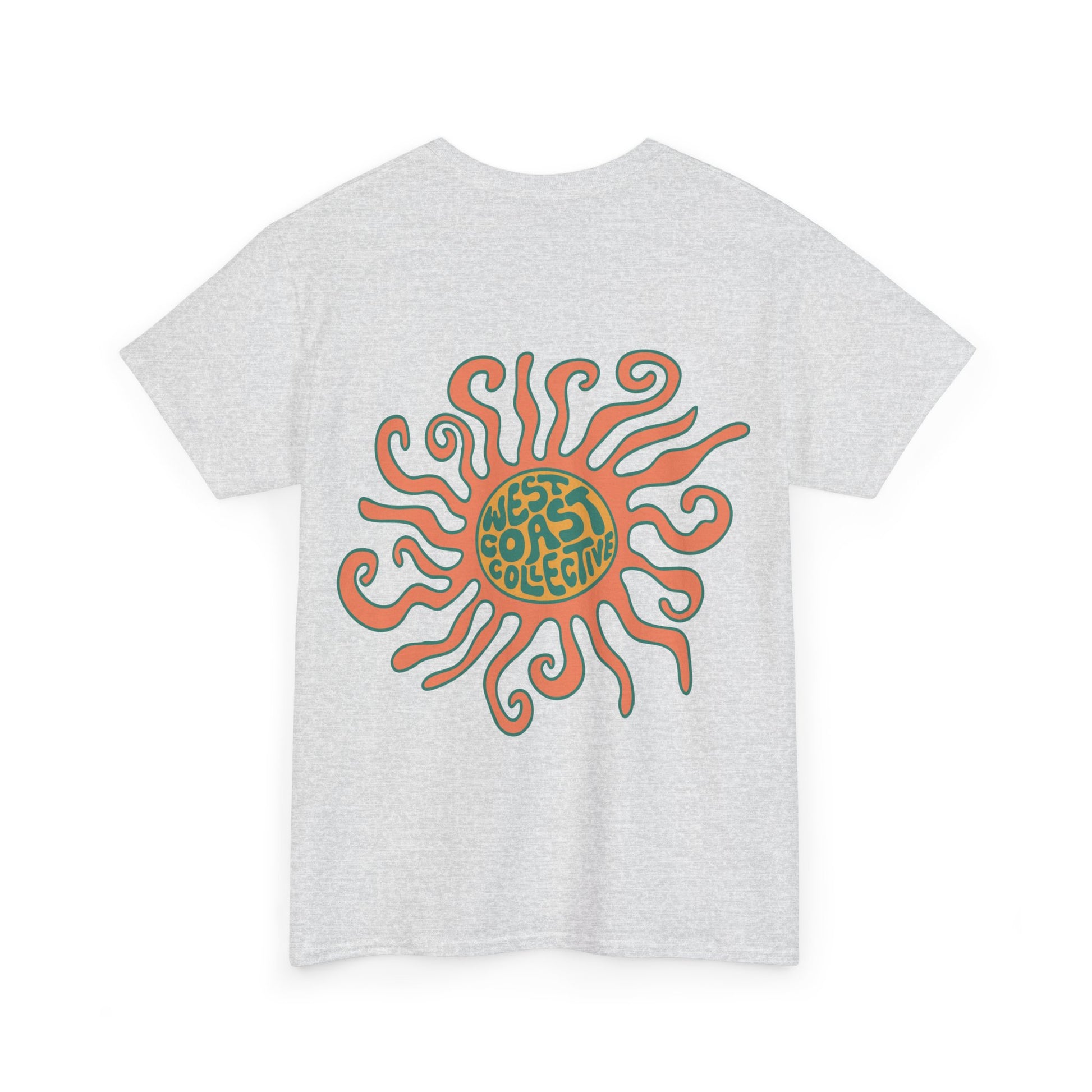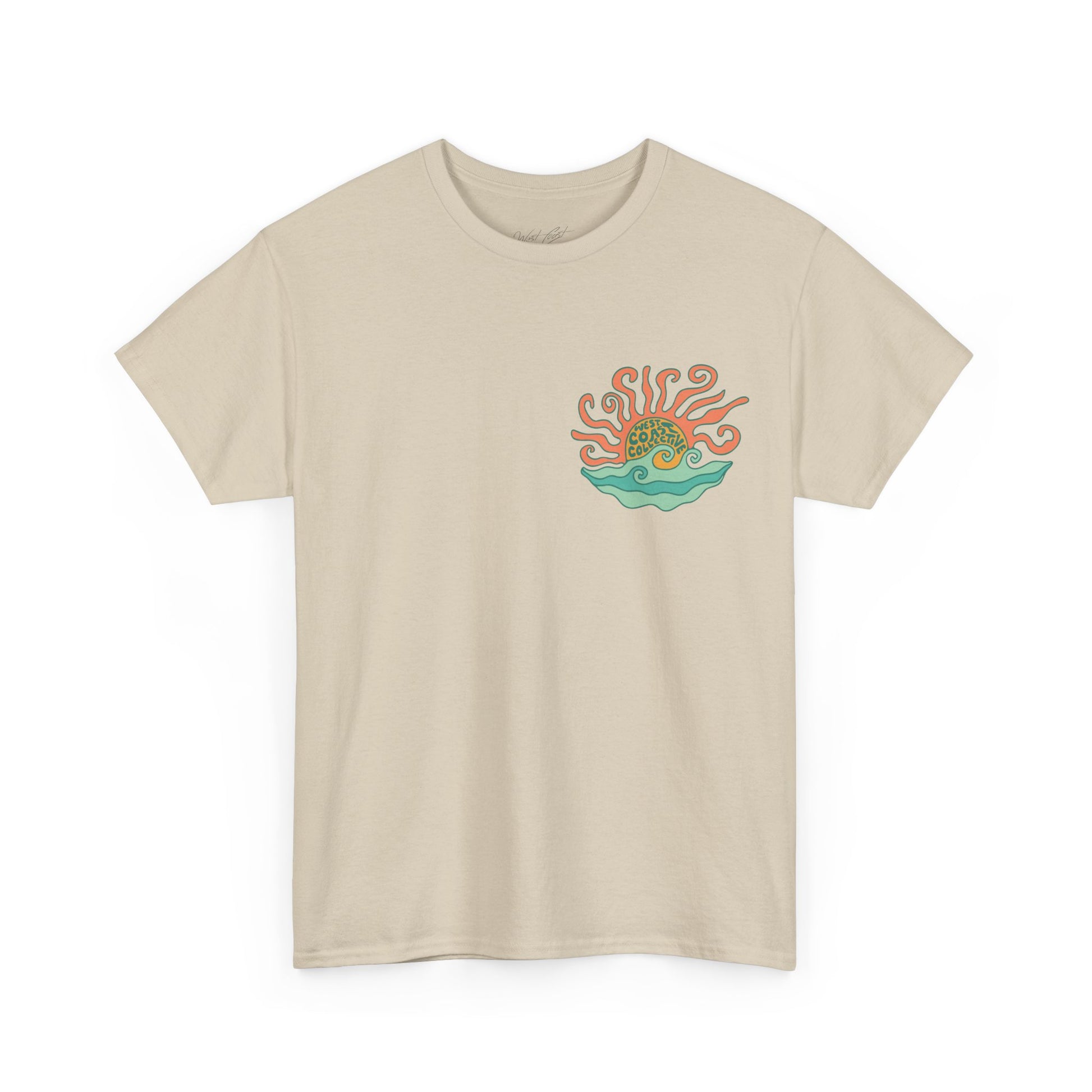 This Sunny side tee is your new everyday staple, inspired by slow coastal mornings and golden sunsets. Featuring a vibrant, hand-drawn sun and wave design on the front, and fun sun design on the back it captures the soul of the West Coast in every thread.